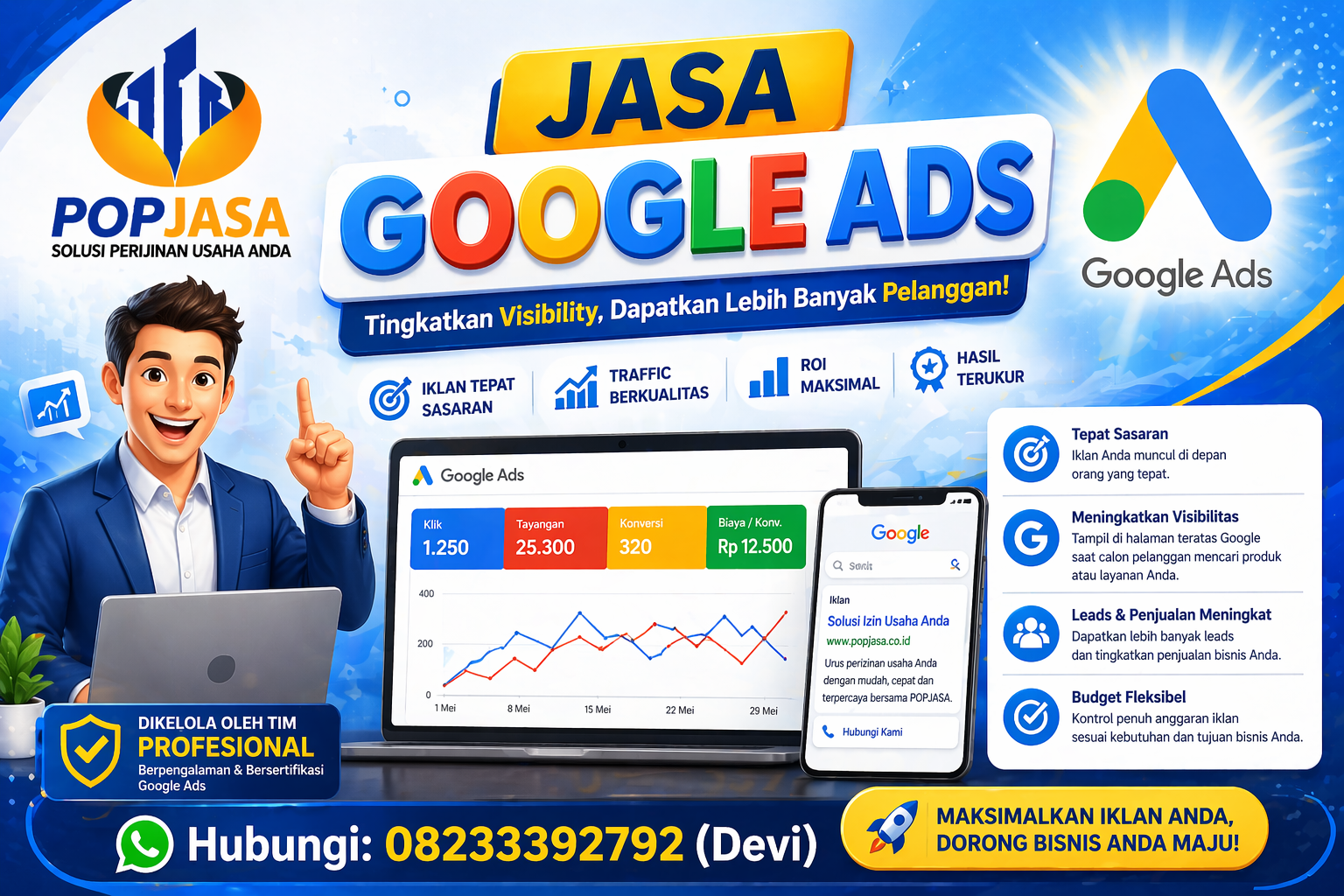 Mengelola kampanye Google Ads membutuhkan waktu, mulai dari riset keyword, pembuatan iklan, hingga optimasi. Dengan menggunakan jasa profesional, Anda bisa fokus pada pengembangan bisnis, sementara tim ahli menangani iklan Anda.